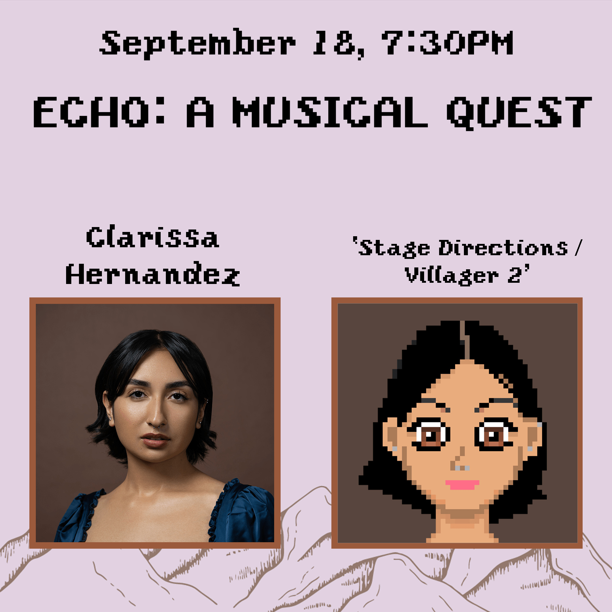 ECHO: A MUSICAL QUEST is a video game musical that is inspired by the Greek mythology of Echo, a mountain nymph who was cursed by Hera to only be able to repeat the last words someone says to her. Our game explores what happens to Echo after she’s been cursed, and follows her as she embarks on a journey to find her voice again.